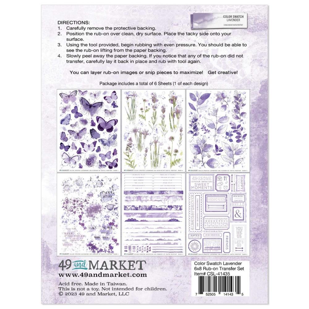 6 sheets of rub-on transfers in a beautiful lavender color range. Each sheet measures 6x8 inch and is loaded with various watercolor images of florals, butterflies, splashes, edges, word art and more. They can be applied to a variety of clean surfaces for a unique and beautiful effect. Imported.