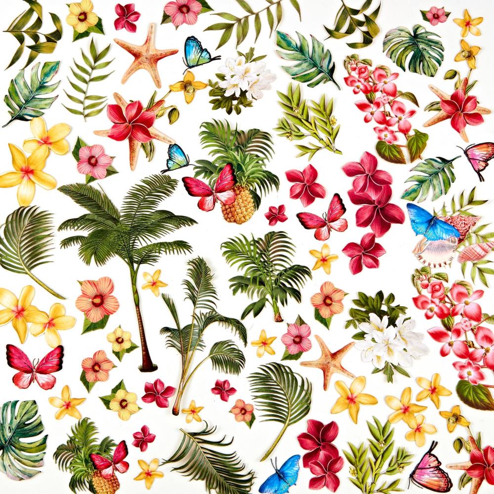 The Vintage Artistry Sunburst Tropical Foliage Laser Cut pack includes a total of 70 pieces. Elements include trees, florals, butterflies, foliage, starfish and more! Precision cut elements can easily be removed by releasing the tiny tabs which secure pieces to the sheet. This package contains four sheets of 6x12.5" heavyweight cardstock. Imported.