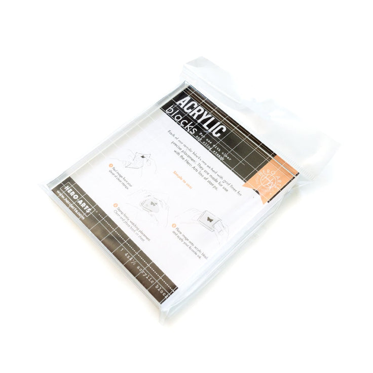 A 4" x 4.5" clear acrylic block, designed to work with Hero Arts clear and cling stamps. The block is etched with grid lines for precise placement.