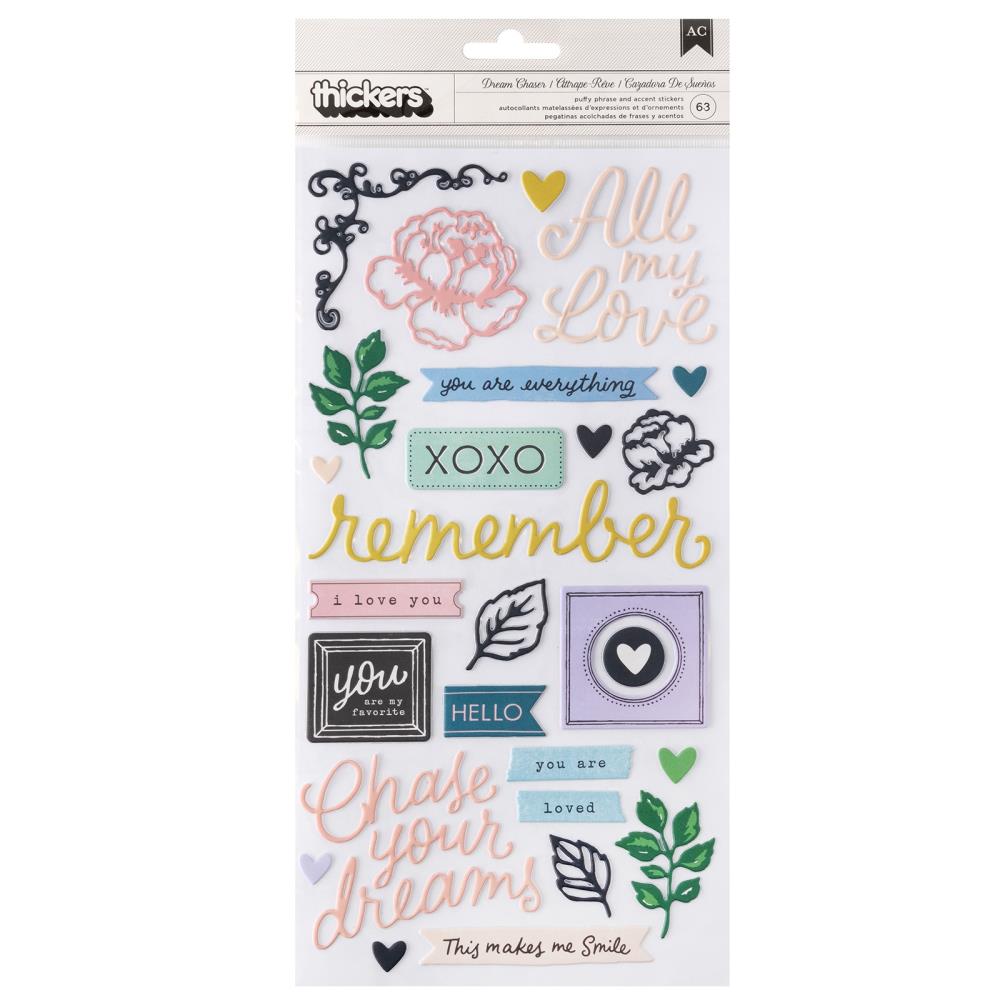 Thickers are the perfect embellishment for any project. They're great for adding just the right amount of dimension and color to scrapbooks, cards, planners, and more. This package includes Thickers phrases and accents in a variety of designs and sizes. Ideal for scrapbooks, cards, home decor, and so much more. Great for adding the perfect amount of dimension to projects. An easy and fun way to add color and flair, or to keep photos, notes, and ephemera in placePair: Pair with other Maggie Holmes products for beautiful projects every time. This package contains 63 Thickers phrases and accents in a variety of designs and sizes. Imported.