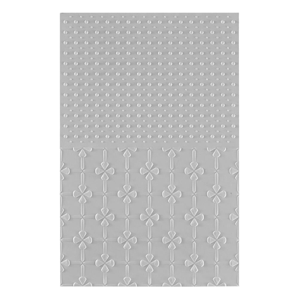 Polka Dot & Posy Duo 3D Embossing Folder is a 5.50 x 8.50 in. embossing folder unique with two different designs in one! One half is posey florals on a grid background and the other is a polka dot motif of small and large dots. Cut your embossed panel in half to create two A2-sized (4.25 x 5.5 in.) card fronts or leave it as is! So clever! This versatile 3D Embossing Folder can texturize the surface of various card sizes from A2-size (4.25 x 5.5-inch) to a Slimline Size (3.5 x 8.5-inch). For the most detailed impression, lightly mist the cardstock with water before embossing.