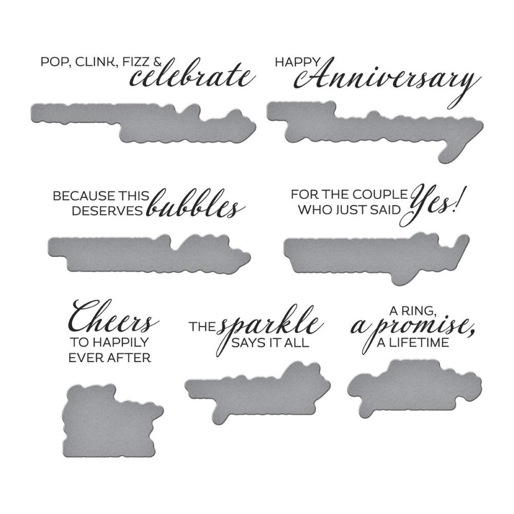 A Special Toast Sentiments BetterPress Plate & Die Set is part of the Happier Hour Collection. Press seven sentiments all at once on one press plate and die-cut the sentiments with its coordinating thin metal cutting die. A time saving set to get you started with seven sentiments. Full of playful sentiments for swanky celebrations, this set pairs well with S5-720 A Special Toast Die Set. Ink the plates with the BetterPress Ink to be pressed against the BetterPress Cotton Card Panel and Sheets for a crisp letterpress design. Only four easy steps for professional results!