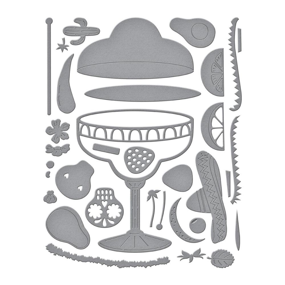 Sip Sip Ole Etched Dies are part of the Happier Hour Collection. When assembled, this set of 27 thin metal cutting dies creates festive drinks based on a stemmed wide rim Margarita glass. Details include a line of salt to set on the glass rim and plenty of garnishes to choose from. For extra fun, there are accents to add to set the vibe: sombrero, cactus, sugar skull, strawberry and more! Celebrate milestones and the everyday through ice cream floats, mocktails and other fun drink concoctions in this Happier Hour Collection! Perfect for events like birthday parties, weddings, girls weekends and more. Approximate Size: Finished Sombrero Margarita: 3.48 x 3.88 in./8.80 x 9.90 cm Finished Strawberry Margarita: 2.77 x 3.47 in./7.09 x 8.80 cm
