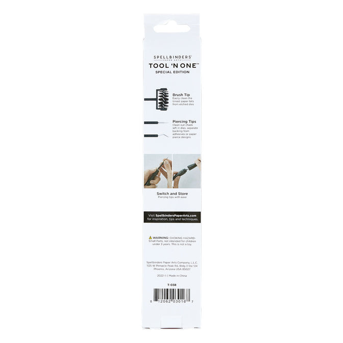 The Spellbinders® Tool 'n One is a crafter's dream - all your tools at your fingertips. Now in a new sleek black color! It is a portable tool that performs multiple craft functions, including piercing, paper removal and many more! In addition, it provides a unique storage solution. The Tool 'n One attachments are housed within the pod of its main body. The tool easily crosses over for other hobbyists using small pieces and parts such as airplane models and miniature houses.